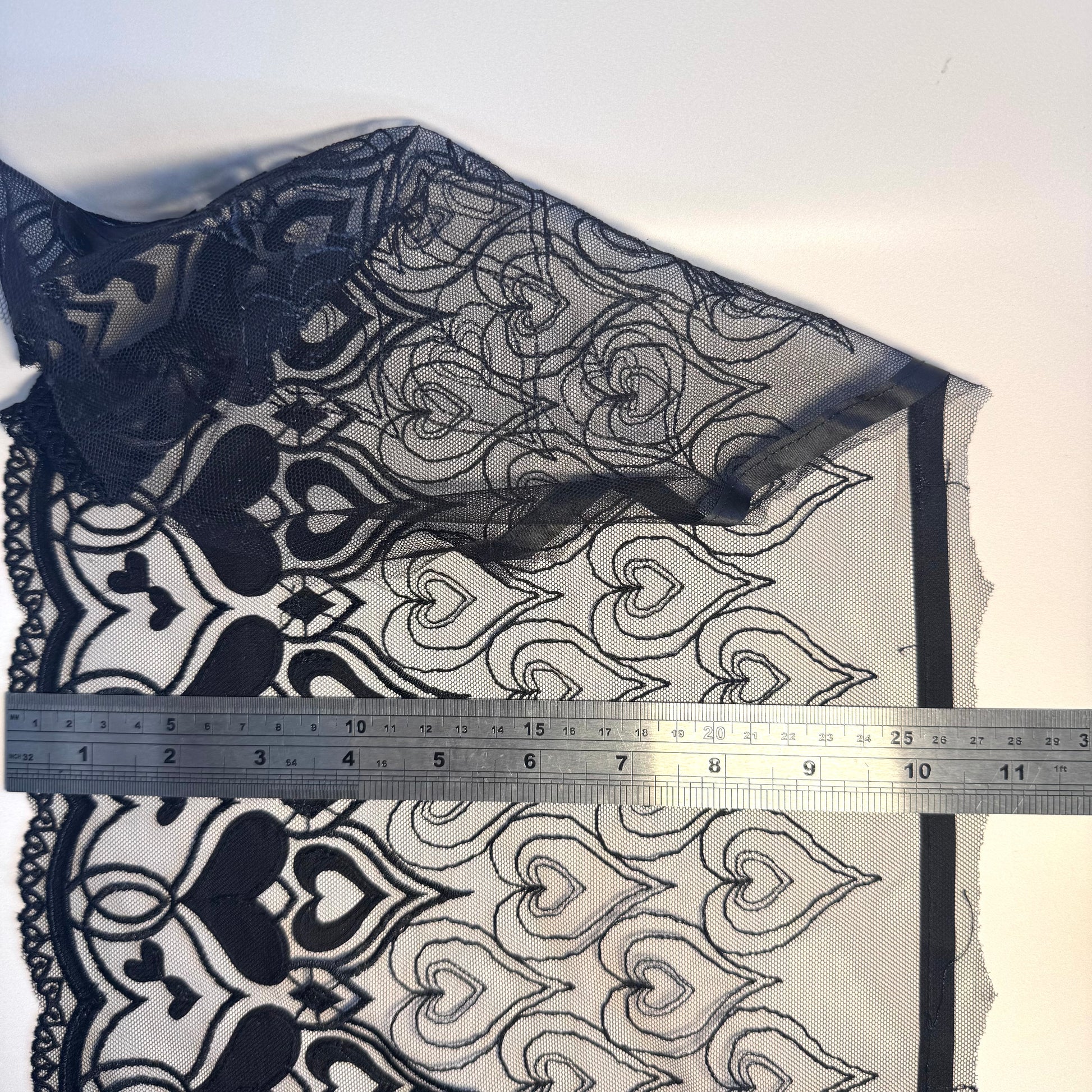 This 26 cm wide lace is called black hearts, due to the gorgeous heart designs all over this lace. The shape and direction allows you to play around with the scalloped edge and create great visual interest.
