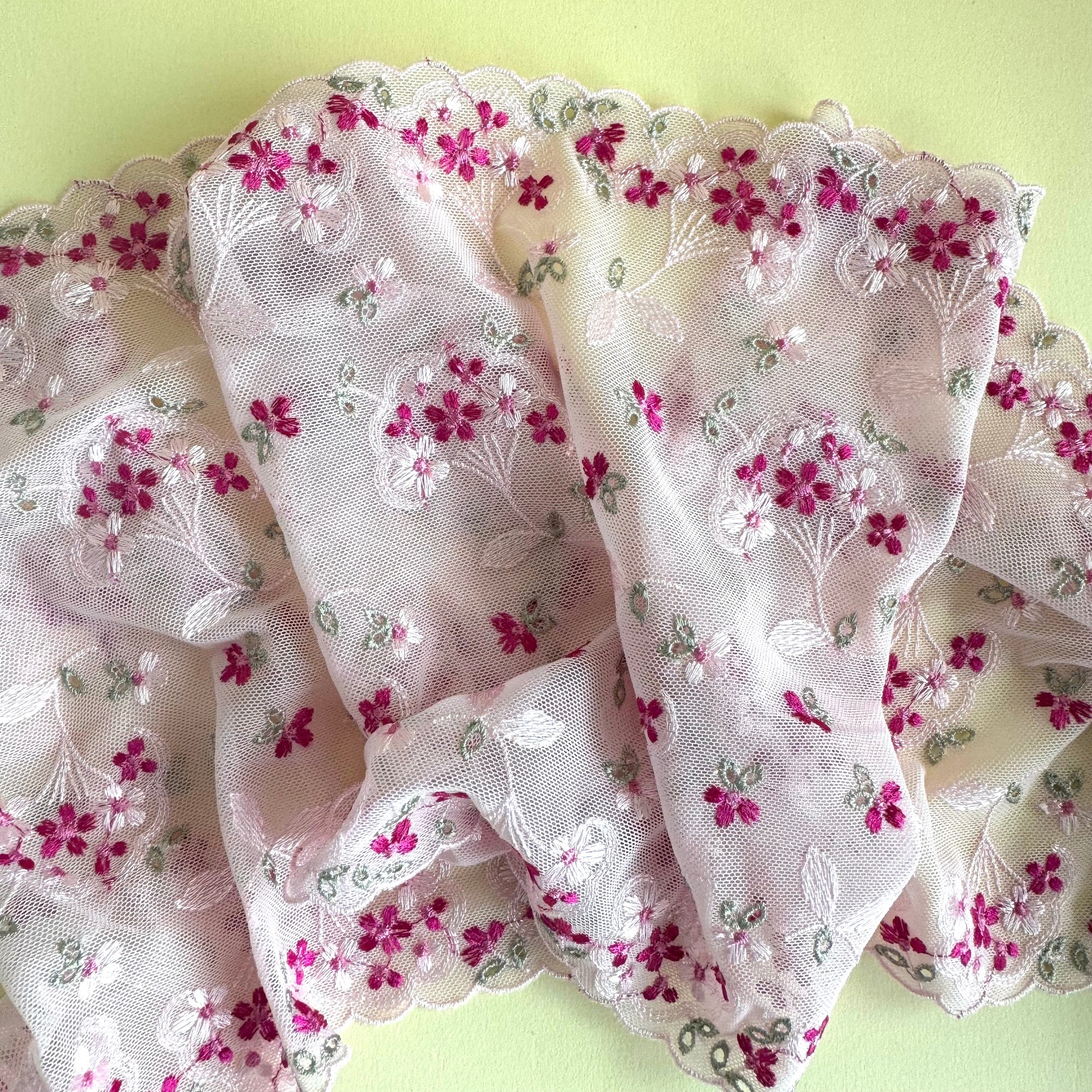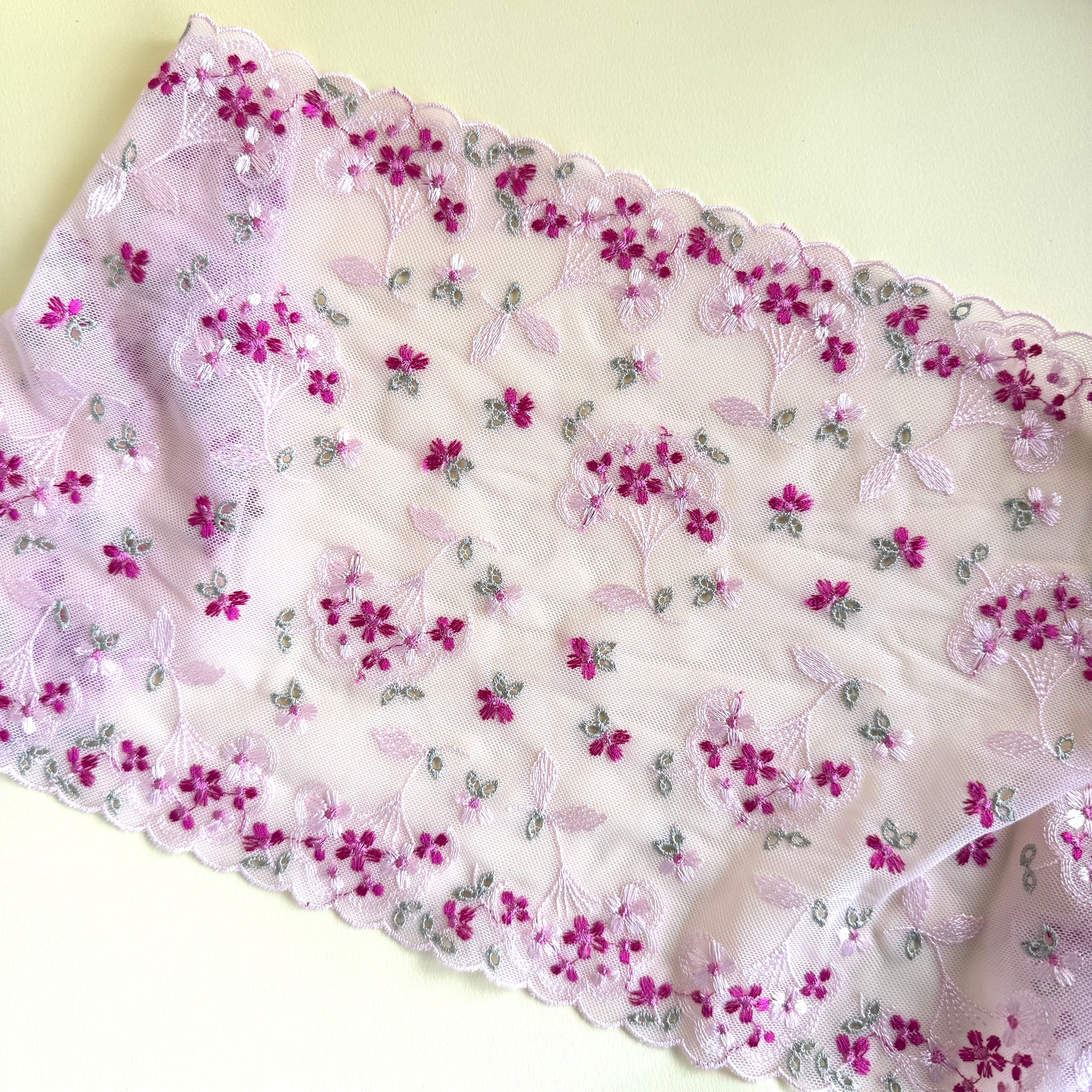 This is the same as our other blooming flowers , however in a smaller width. It is still a stretch lace, in that it can be used to make a cute matching set. Only available in the pink colour way.
